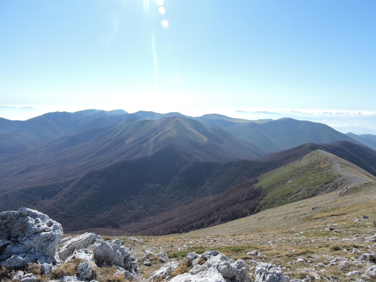 Sempre in costante salita, percorrendo un sentiero ben segnato con vernice bianco-rossa usciamo dallo splendido bosco e finalmente il nostro sguardo si posa sui panorami di buona parte dell'Italia Centrale.