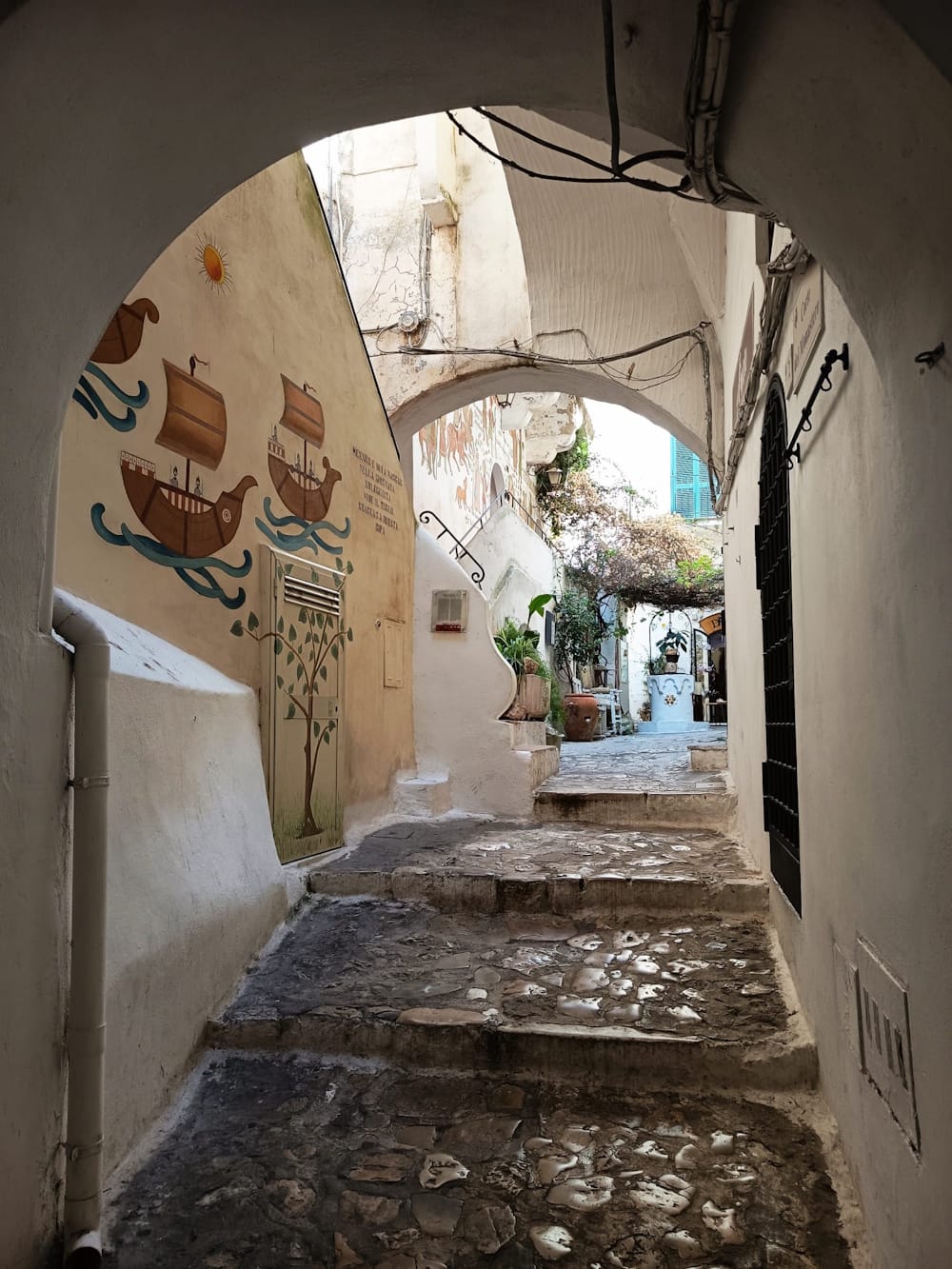 Il borgo è un dedalo pittoresco di vicoli bianchi, piazzette animate, opere d’arte muraria e scorci romantici, tutti incorniciati da pareti naturali e il mare turchese sullo sfondo