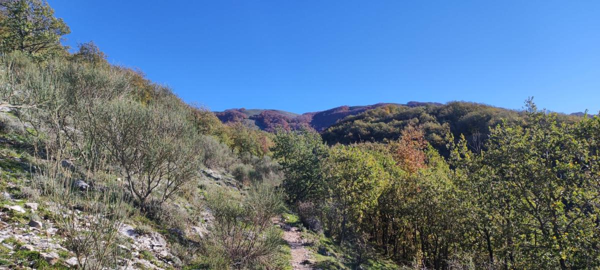 Discendiamo quindi dalla vetta percorrendo circa 350 mt fino a raggiungere il margine della faggeta per intercettare i segni bianco-rossi che ci porteranno, inoltrandosi nuovamente in discesa all'interno del bosco ben segnato ed in pendenza più marcata, dopo circa due km al rifugio la Casa del Pastore.