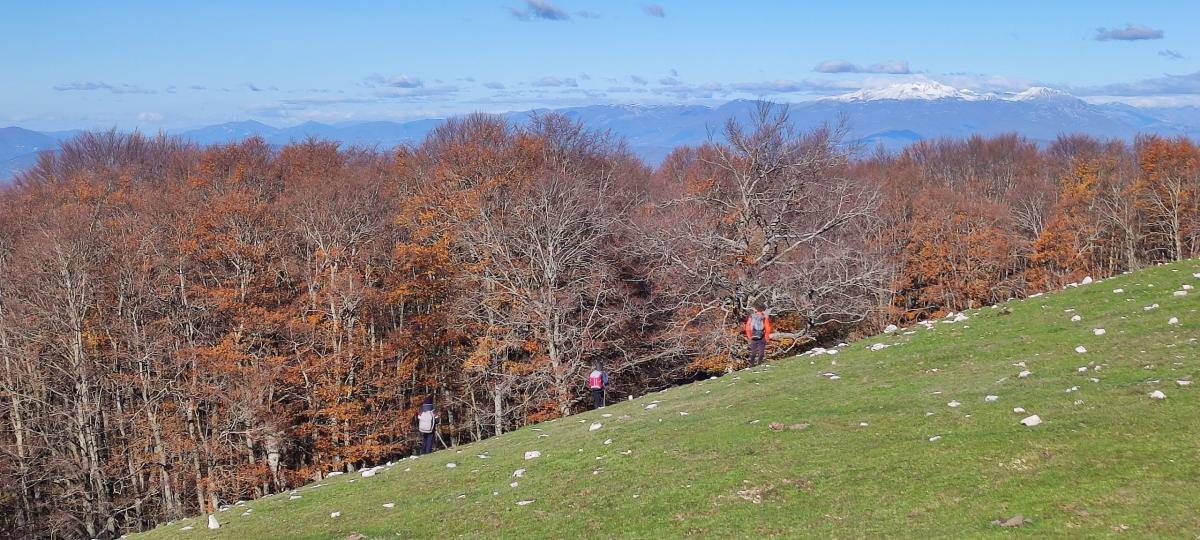 Da qui e per quasi tutta la cresta che, percorrendo il percorso ad anello, ci accompagna sempre dolcemente sopra la Valle di Licenza, si apre il panorama delle cime ormai innevate che spaziano dai Monti Reatini alla nostra sinistra, al Gran Sasso fino ad arrivare al gruppo del Velino-Sirente con la vetta del Sevice e oltre alla nostra destra.